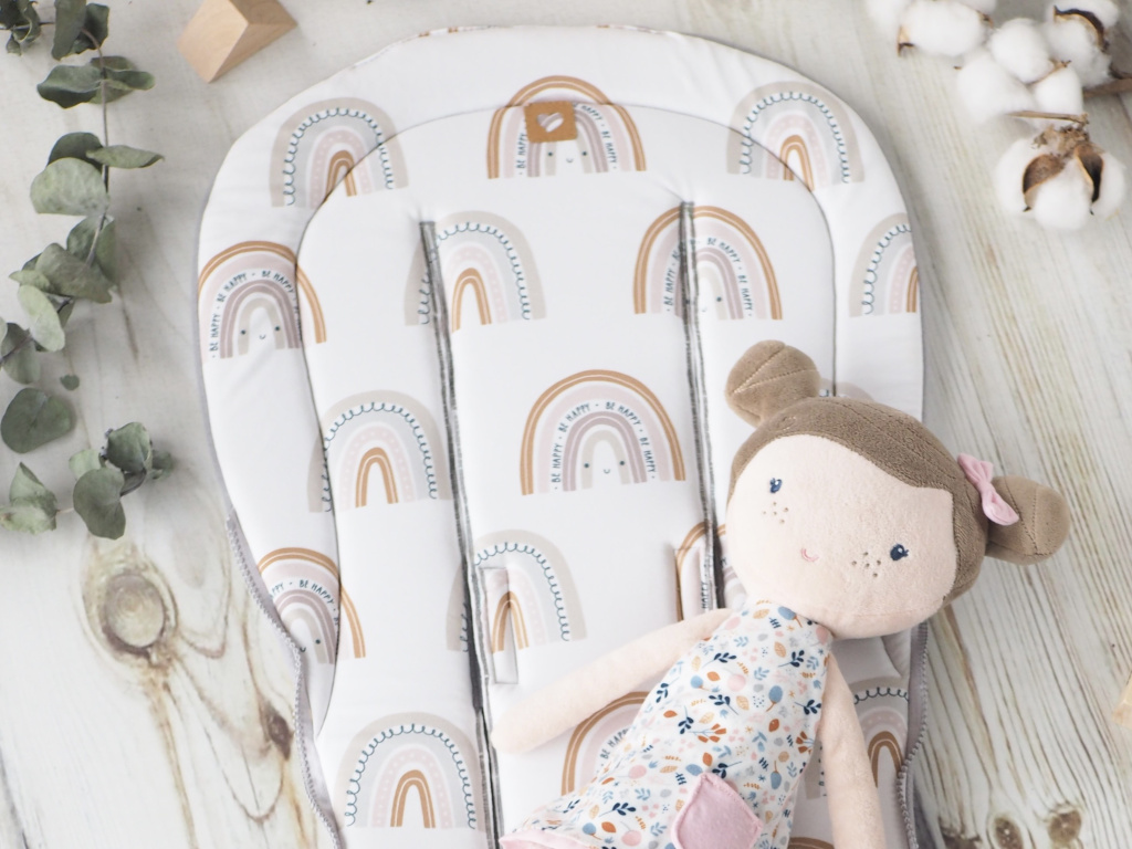 Podložka má uprostřed šnůrky k uchycení ke kočárku na několika místech a navíc ve spodní části gumu, což zajišťuje, že podložka nesjíždí a drží na místě.