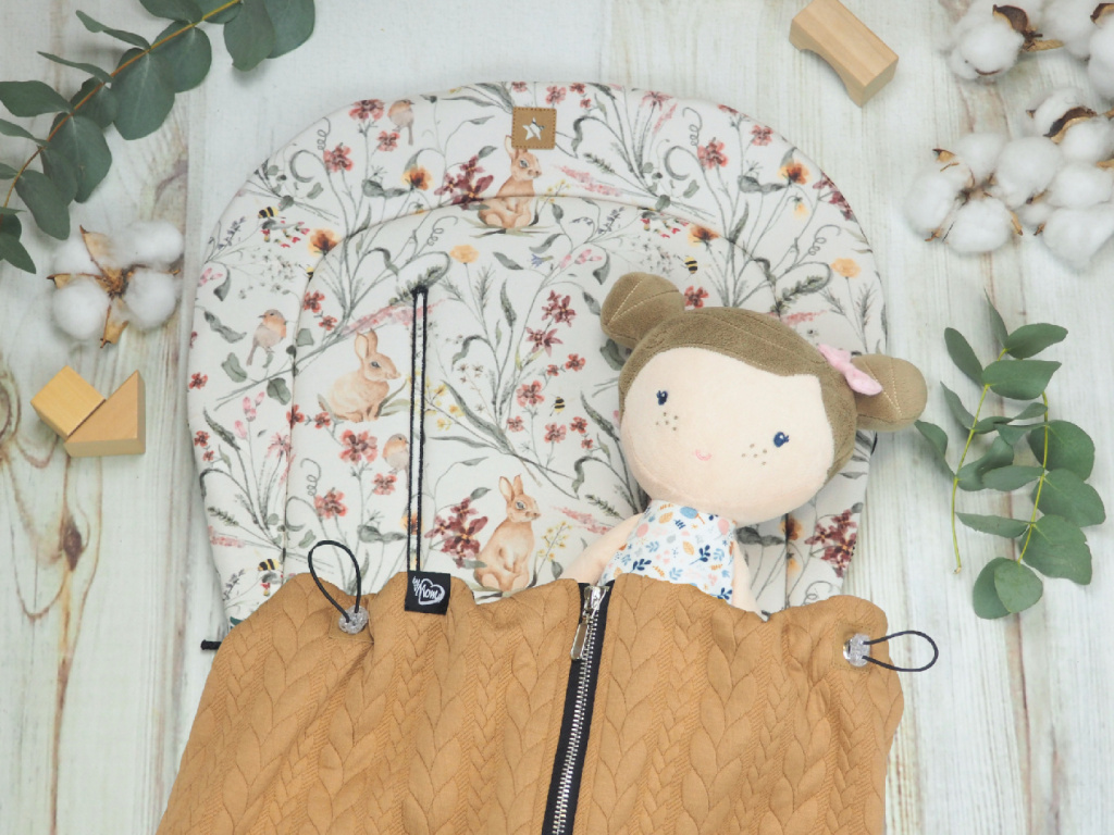 Podložka má šnůrky na uvázání ke kočárku a ve spodní části také gumu na zachycení, díky tomu podložka neklouže.