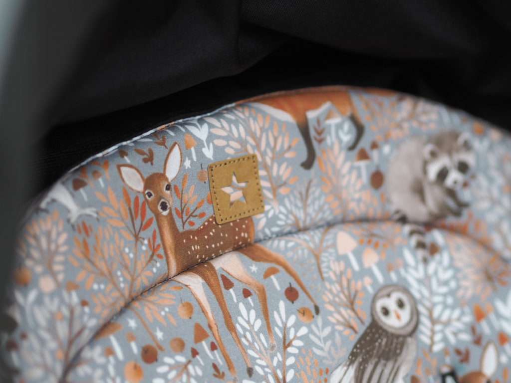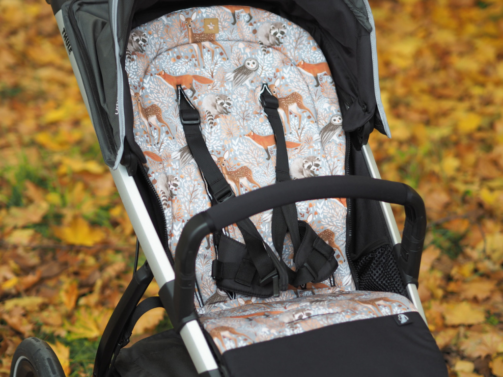 Podložka má na několika místech na boku i vzadu šnůrky na uvázání ke kočárku a ve spodní části také gumu na zachycení, díky tomu podložka opravdu neklouže. Střih podložky je speciálně navržen tak, aby sedl do naprosté většiny kočárků na trhu a díky prošívání se vejde i do užších kočárků!
